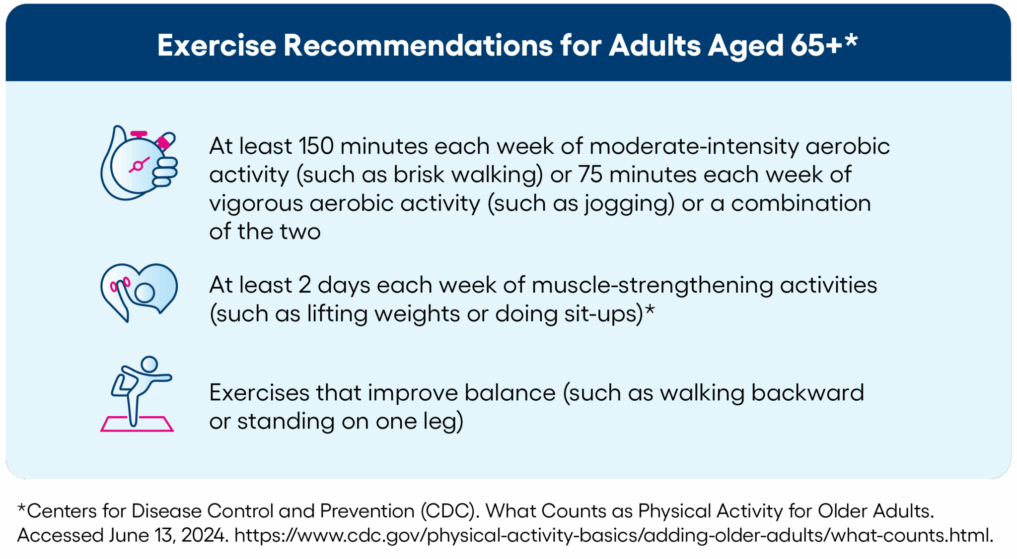 The Centers for Disease Control and Prevention (CDC) has recommendations for how much physical activity an adult aged 65 or older should get per week.